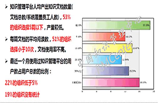 知識管理的重要性無需多言,但很多管理者認為這是一件“不可能完成的任務(wù)”。也的確有不少“慘烈”的例子,剛開始時轟轟烈烈,逐漸偃旗息鼓,最后費時費力上馬的知識管理系統(tǒng),只做員工閑來翻翻之用。KM CENTER經(jīng)過調(diào)研后,在其《中國知識管理現(xiàn)狀、問題和趨勢:2012中國知識管理實施調(diào)研結(jié)果分析》中給出了右圖的一組數(shù)據(jù)。