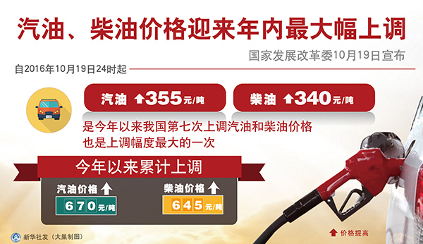 國(guó)家發(fā)展改革委19日宣布,根據(jù)近期國(guó)際市場(chǎng)油價(jià)變化情況,按照現(xiàn)行成品油價(jià)格形成機(jī)制,自2016年10月19日24時(shí)起,國(guó)內(nèi)汽油、柴油價(jià)格每噸分別提高355元和340元。