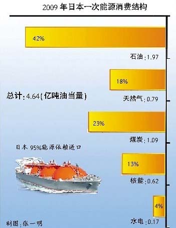 盡管日本一直大力推進(jìn)新能源開發(fā)和利用,但石油在日本的一次能源消費(fèi)結(jié)構(gòu)中仍占主導(dǎo)地位!BP能源統(tǒng)計2010》的數(shù)據(jù)顯示,石油在日本2009年能源消費(fèi)構(gòu)成中,仍然占約42.7%。