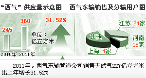 4個氣源同時運行,使“西氣”資源出現(xiàn)了跨越式增長。2009年,“西氣”的供應(yīng)量為199億立方米,2010年為245億立方米,2011年為360億立方米。資源增長一年上一個大臺階。