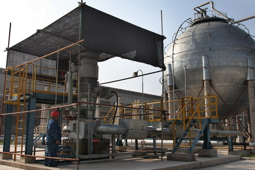 圖為設(shè)備員正在為每小時60噸聚乙烯原料輸送機泵搭設(shè)涼棚。廖和明 攝