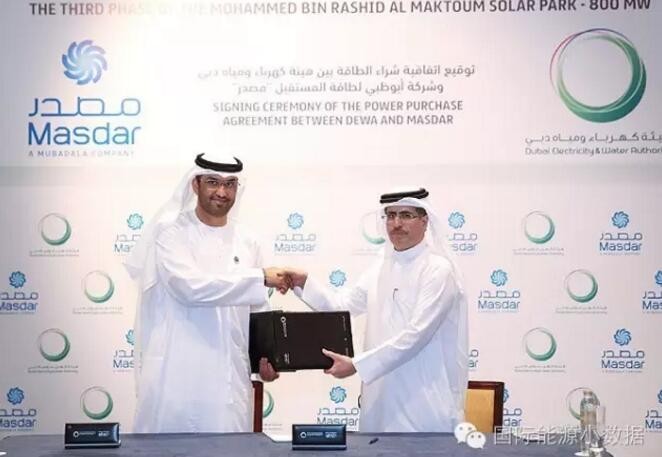 2016年11月29日,迪拜電力和供水機構(gòu)(DEWA)與阿布扎比未來能源公司(Masdar)正式簽署了迪拜(Mohammedbin Rashid Al Maktoum Solar Park)光伏園第三期800兆瓦項目的購電協(xié)議,成交價格為0.299美分/千瓦時,創(chuàng)全球歷史上最低的光伏價格。
