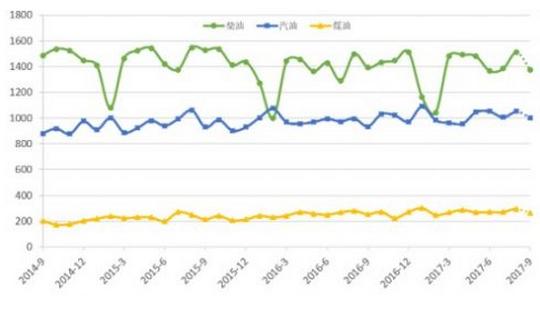 圖:2014年9月至今全國汽、柴、煤油月度消費(fèi)量(單位:萬噸)