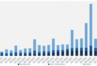 報(bào)告顯示,公共事業(yè)板塊中領(lǐng)先的是內(nèi)華達(dá)州、北卡羅來(lái)納州和德克薩斯州。其中,德克薩斯州2017年第三季度光伏裝機(jī)量比2015全年所有太陽(yáng)能裝機(jī)量還多。美國(guó)東南地區(qū)光伏市場(chǎng)剛剛起步,佛羅里達(dá)州、密西西比州、南卡羅來(lái)納州都實(shí)現(xiàn)強(qiáng)勁增長(zhǎng),且預(yù)期2017年光伏裝機(jī)量將高于此前多有年份。根據(jù)SEIA,當(dāng)前全美處于建設(shè)當(dāng)中的公共事業(yè)規(guī)模光伏項(xiàng)目有4GW,GTM Research預(yù)測(cè)到年末還將增加3.9 GW。這樣一來(lái),2017年將成為美國(guó)光伏裝機(jī)量第二大的年份,僅次于2016年。