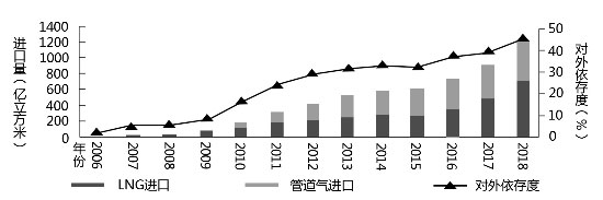 中國天然氣進(jìn)口量及對外依存度變化(來源:2018年國內(nèi)外油氣行業(yè)發(fā)展報告)